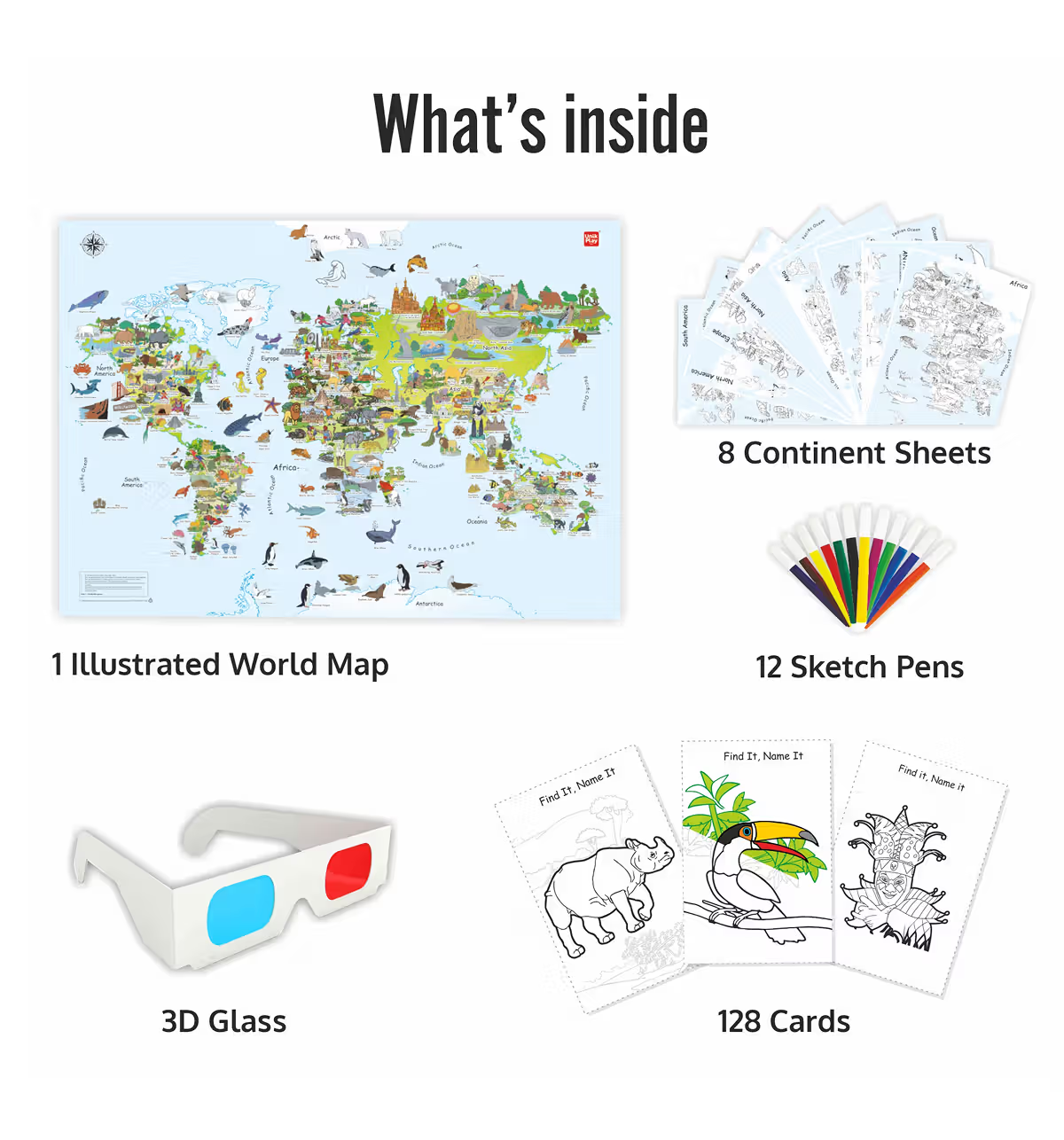 The 2-in-1 Colour & Play Kit is a creative educational activity designed to make learning geography fun and interactive for kids (recommended age 6 years+) by combining coloring and play.