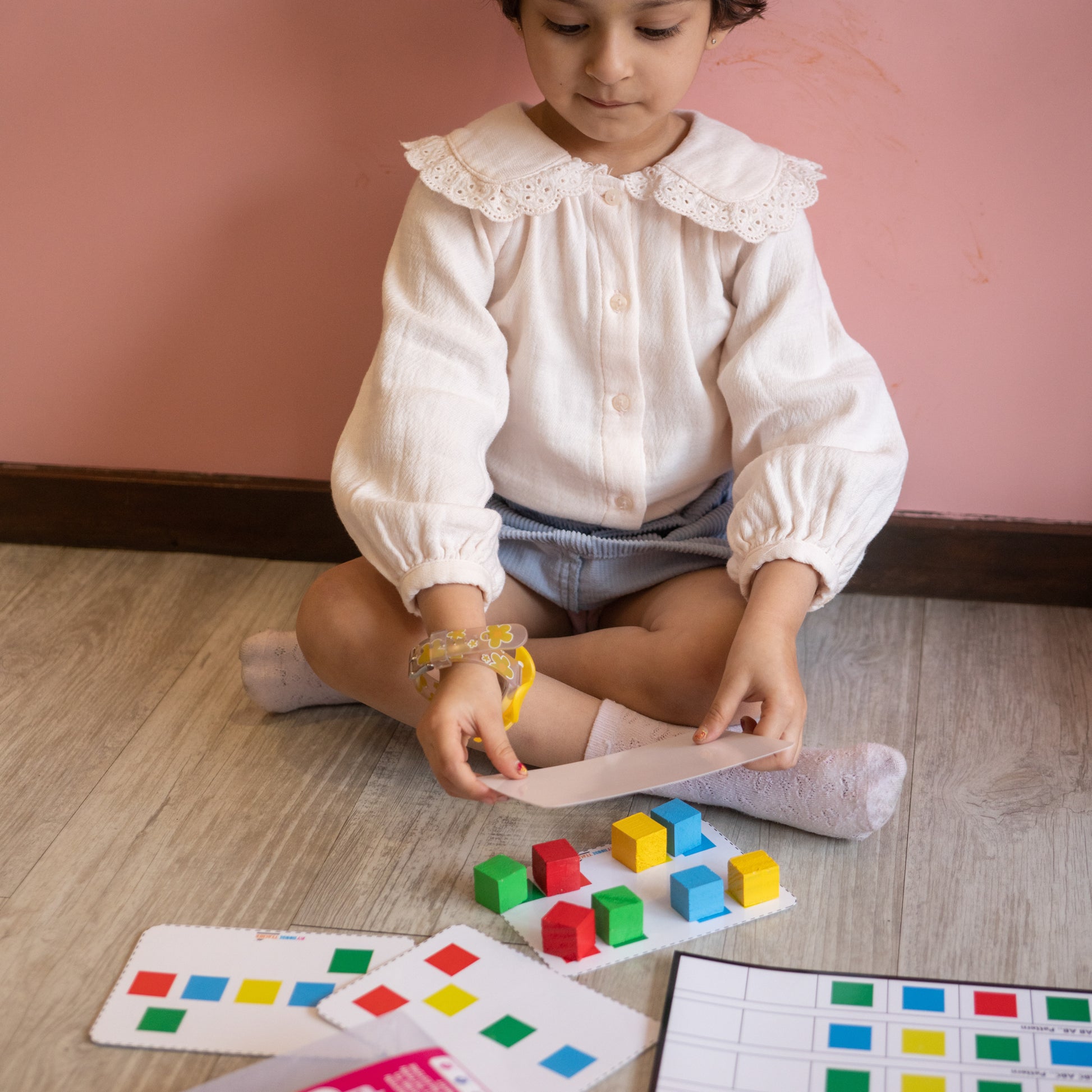 Packed with 3 Creative Project with 6 different trail tracing cards and write and erase pens, 8 wooden color cubes, 6 different pattern activity cards-basic and advanced level, Foam sticker sheets, and 6 different cards for pasting them.