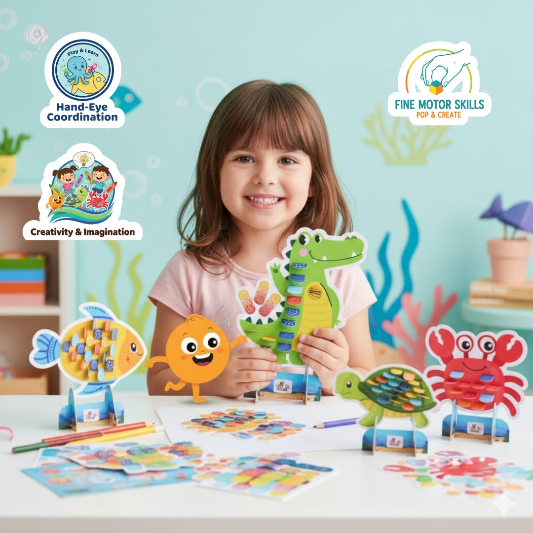 This fun-filled DIY kit lets kids Pop, Create & Bring Sea Animals to Life. With colorful popping stickers and adorable ocean buddies like fish, turtle, and crab, children will enjoy hours of screen-free, mess-free, and imagination-packed play.