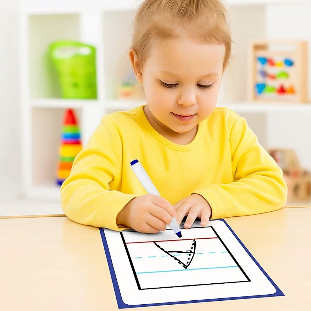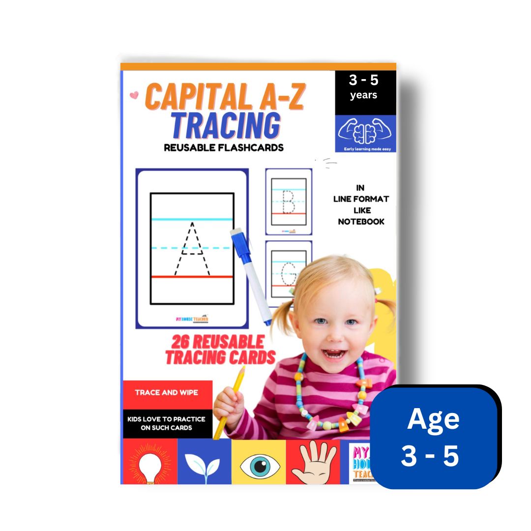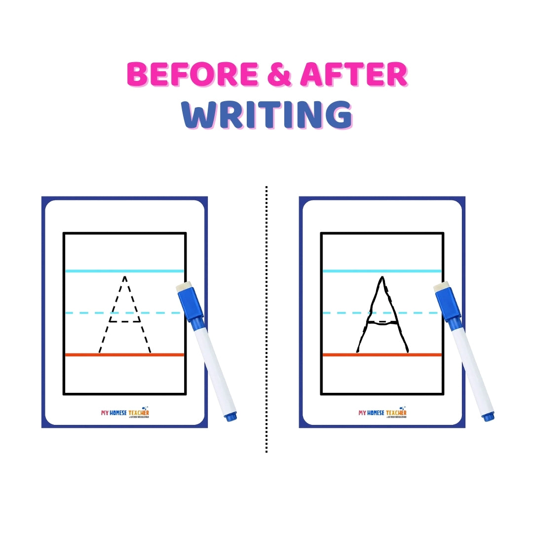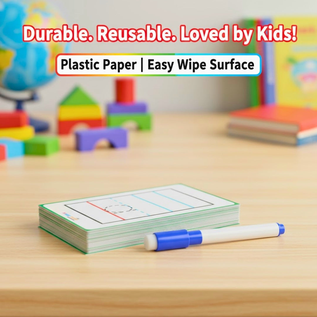 Kids can practice writing alphabets in capital any number of times in this four line drawn flashcards. Write and Erase pen provided for your convenience.