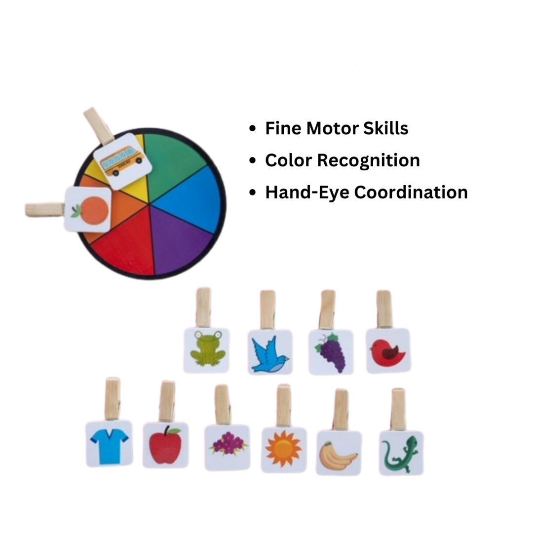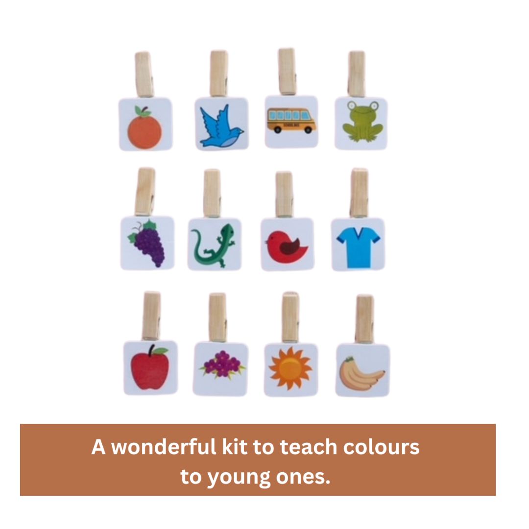 - Learn Colors: 6 basic colors, 12 wooden pins.