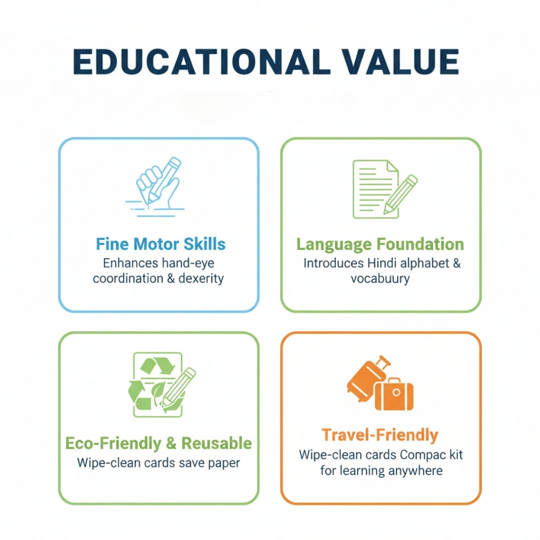 Whether your little one is just starting to learn Hindi or needs extra writing practice, these durable cards are perfect for home learning, preschool, or travel. Simply wipe and reuse — no tearing, no mess!
