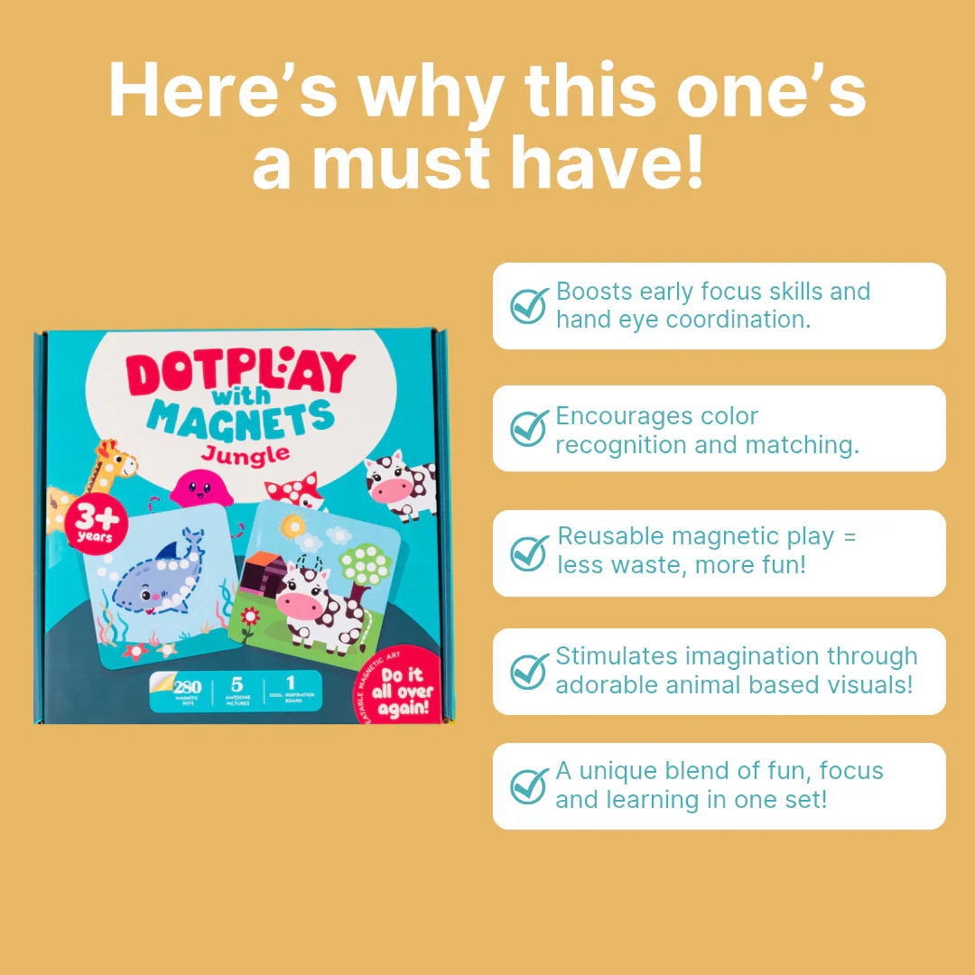 Let your child step into a wild world of colors and creatures with the Magnetic Dot Art – Jungle Playset!
