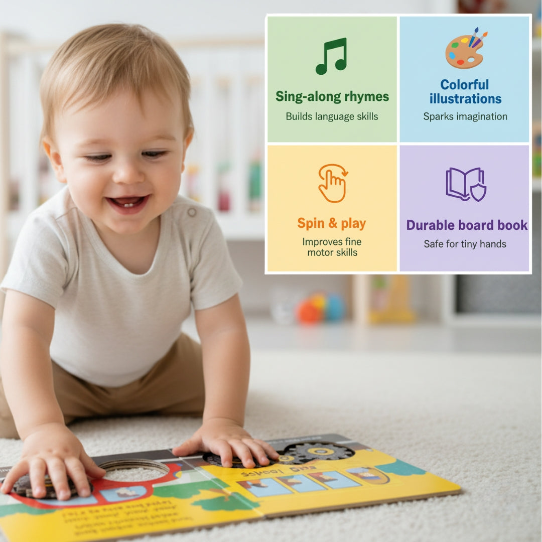 Spin the wheels of the school bus, sing the rhyme, enjoy the illustrations and have a fun time playing with this unique board book!