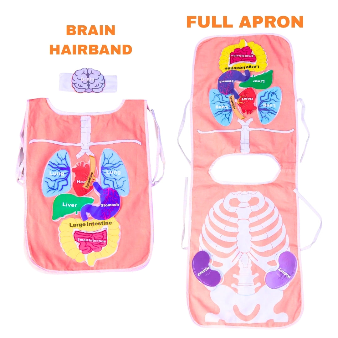 High quality cotton apron ,11 body parts, Brain hair band ,function of organs chart, Easy to storage folder