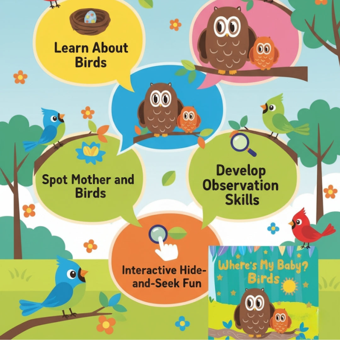 Where’s My Baby? Birds – Illustrated Story Book for Kids is a delightful and educational picture book that takes little readers on a fun adventure through the world of birds. With bright, colorful illustrations and engaging “hide-and-seek” style storytelling, children will enjoy spotting mother birds as they search for their babies.